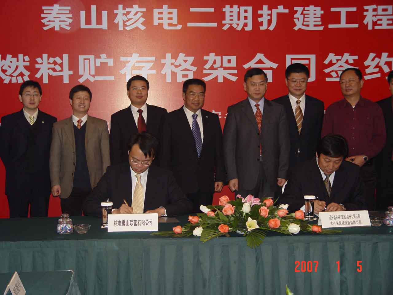 2007年1月5日下午,秦山核電二期乏燃料貯存隔架訂貨合同簽字儀式在大連香格里拉大飯店舉行。集團公司董事長吳巖、核電秦山聯營有限公司楊蘭和總經理等參加了簽字儀式。此次簽約的合同金額為4800萬元,分兩批交貨,供秦山核電二期3、4號機組裝配。在簽字儀式上,核電秦山聯營有限公司楊蘭和總經理對大連寶原核設備有限公司過硬的制造技術和按期保質完成交貨予以高度評價,他表示,寶原公司在制造人員閘門和乏燃料隔架領域有著良好的業績記錄,在國內屈指可數。