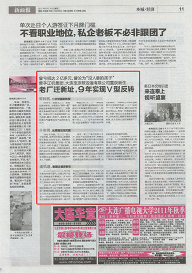 新商報(bào)在2011年8月16日11版中,以“老廠遷新址,9年實(shí)現(xiàn)V型反轉(zhuǎn)”為標(biāo)題對(duì)大連寶原核設(shè)備有限公司進(jìn)行了報(bào)道。原文轉(zhuǎn)載如下: