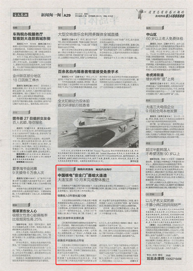 半島晨報在2011年8月16日A29版中,以“中國核電‘安全門’是咱大連造--大連寶原10月末完成整體搬遷”為標(biāo)題報道了大連寶原核設(shè)備有限公司相關(guān)情況。原文轉(zhuǎn)載如下: