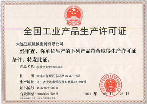 大連遼機(jī)機(jī)械密封公司取得全國(guó)工業(yè)產(chǎn)品生產(chǎn)許可證證書