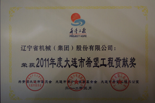 會上,遼寧省機械(集團)股份有限公司被共青團大連市委、市青少年發展基金會和市希望工程辦公室授予“2011年度大連市希望工程‘貢獻獎’”。并當場向市希望工程再次捐助2012年度10萬元助學金。