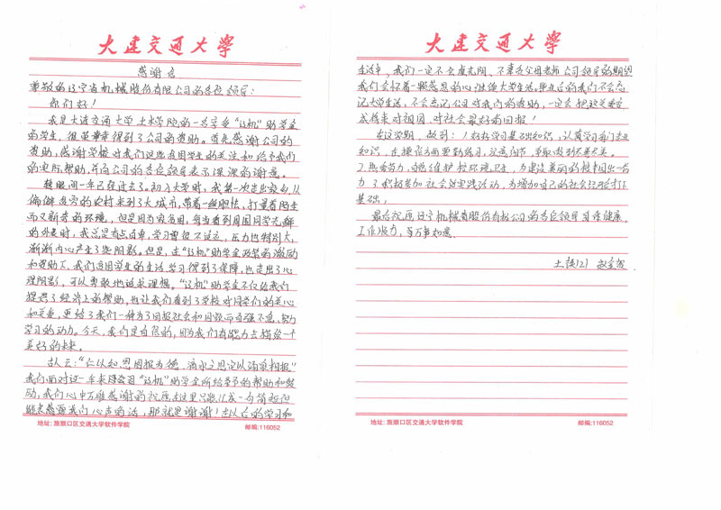 近日,公司收到一封來自大連交通大學的感謝信。寄信人是交通大學土木學院一名大二學生,系2012年遼機助學金的獲得者。在信中,他表示:感謝公司的資助,并向公司的各位領導表示深深的謝意。在遼機助學金政策的激勵和資助下,我們貧困學生的生活學習得到了保障,也走出了心里的陰影,可以勇敢的追求理想,更給了我們一種為了回報社會以及國家自強不息、努力學習的動力。